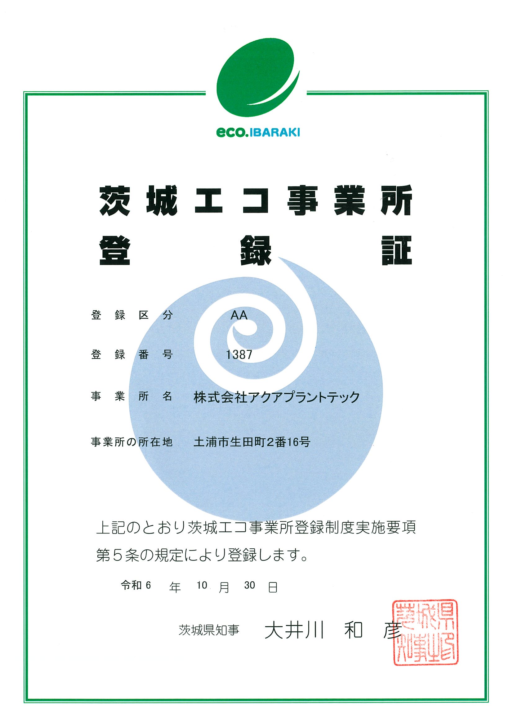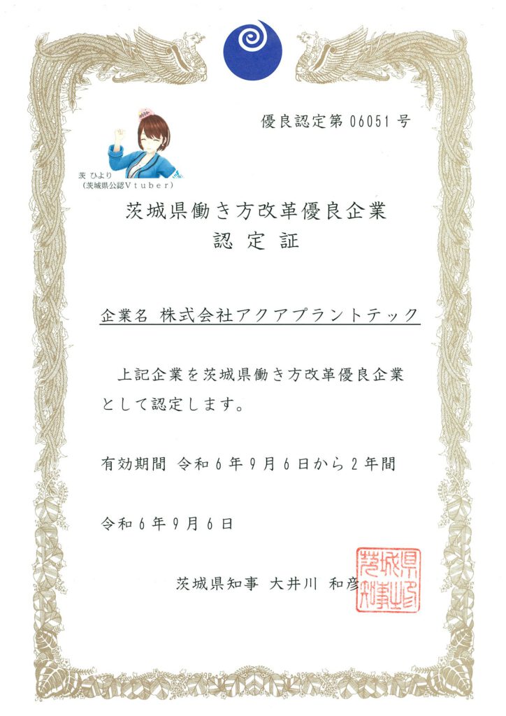 アクアプラントテックは人と環境にやさしい事業活動を推進し、茨城県の「茨城エコ事業所」および「茨城県働き方改革優良企業」として認定されております。