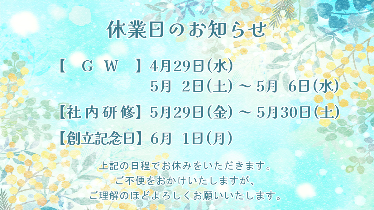 つきましては、ゴールデンウィークおよび創立記念日を下記の日程にて休業させていただきます。
